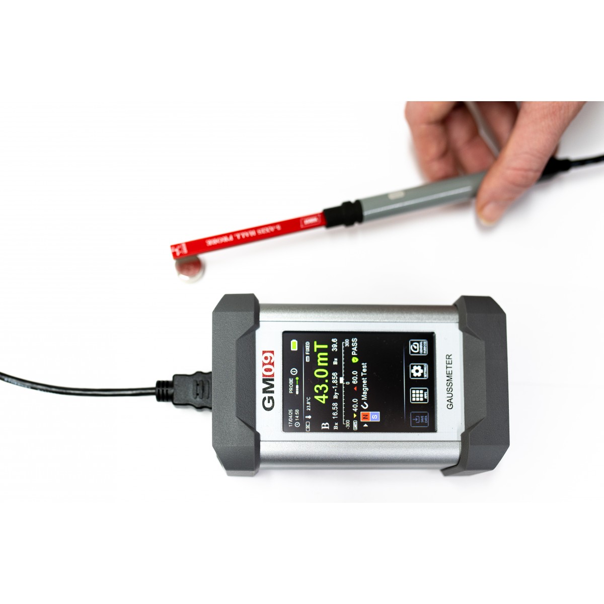 The GM09-3 gaussmeter features a touch-screen interface and rechargeable Li-ion battery for use with the Hirst three-axis Hall sensor probe. The built-in Application “App” modes ensure standard tests and measurements can be carried out with ease and minimal effort. Data-logging features allow the retrieval of data using a simple USB interface, no additional software is needed as the GM09 appears as a USB mass storage device.
