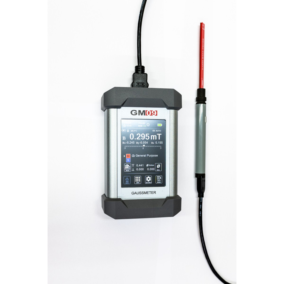 The GM09-3 Gaussmeter is the best device for those needing to measure magnetic field strength and magnetic flux density in all three-axis simultaneously (reducing the risk of measurement error due to misalignment of a single axis probe) with the simplest data access of any Hirst gaussmeter with built in application modes to make standard tasks even easier. With a one year guarantee and calibration certificate included, the GM09-3 Gaussmeter is ready to use and simple to operate.